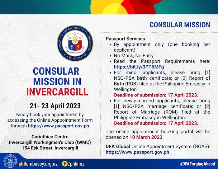 Consular Services for Filipinos in Invercargill 21-23 April 2023