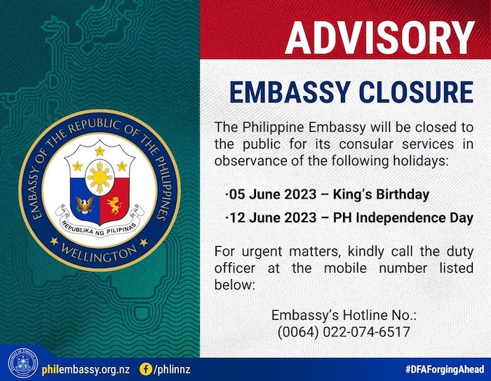 The Philippine Embassy will be closed to the public for its consular services in observance of the following holidays: