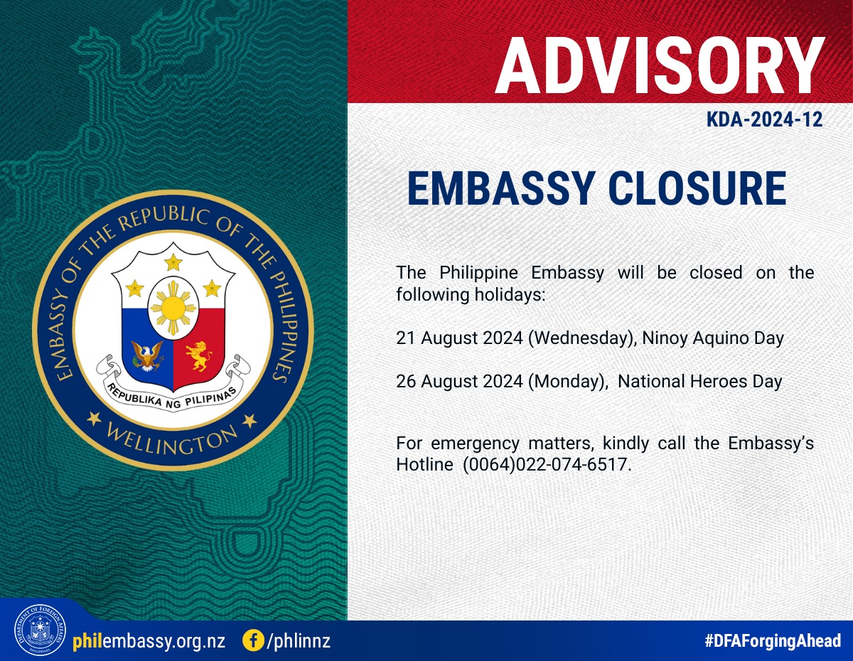 For emergency matters, kindly call the Embassy’s Hotline (0064)022-074-6517.