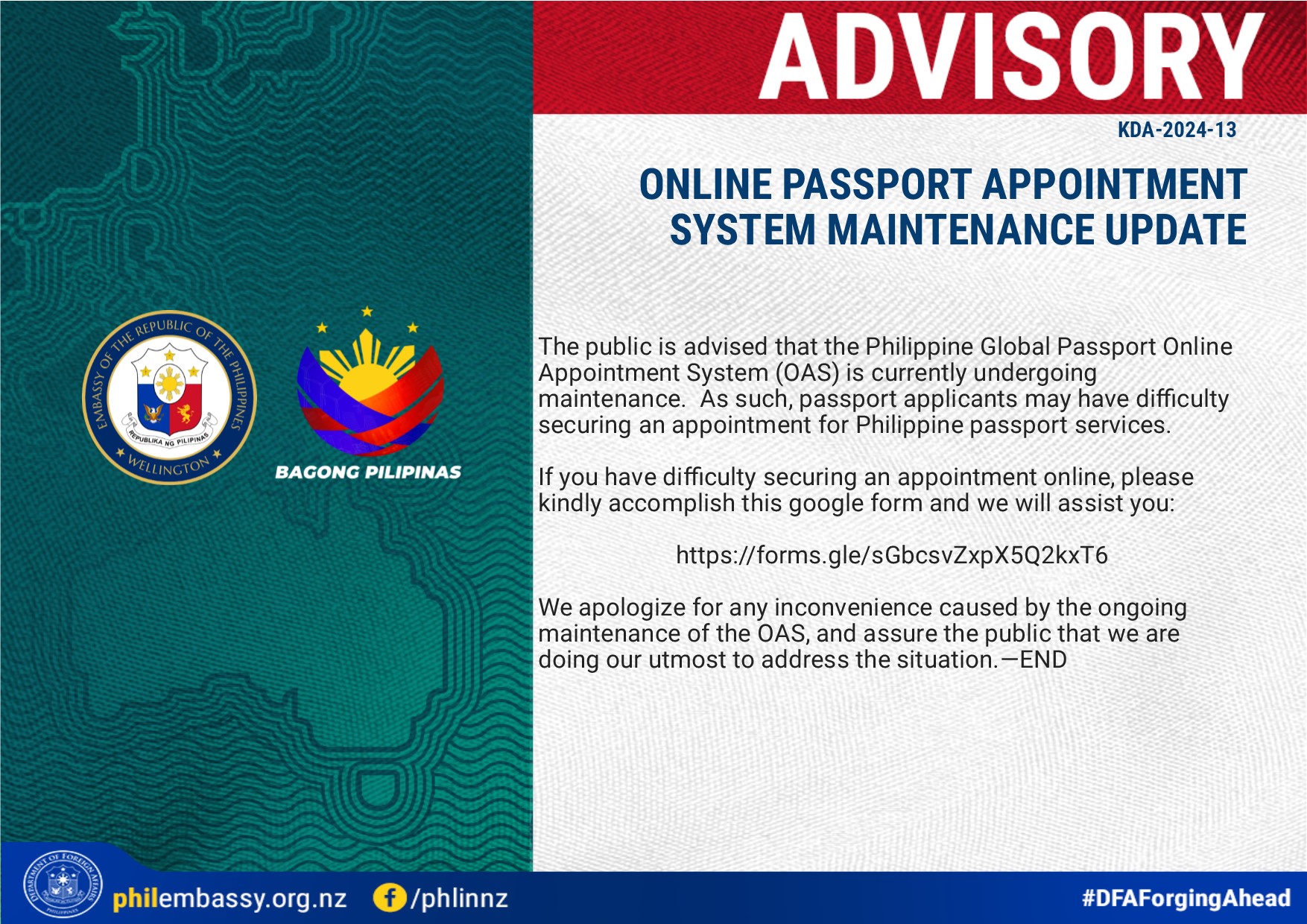 The public is advised that the Philippine Global Passport Online Appointment System (OAS) is currently undergoing maintenance. As such, passport applicants may have difficulty securing an appointment for Philippine passport services.