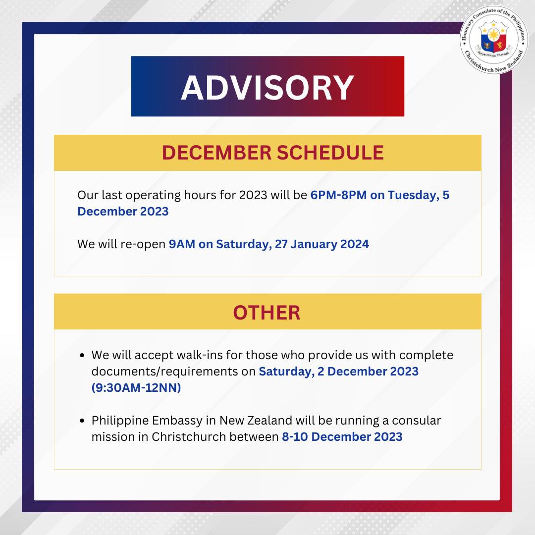 The public is advised that the Philippine Honorary Consulate in Auckland, New Zealand will be closed to the public from Friday, 15 December 2023, until Monday, 08 January 2024.