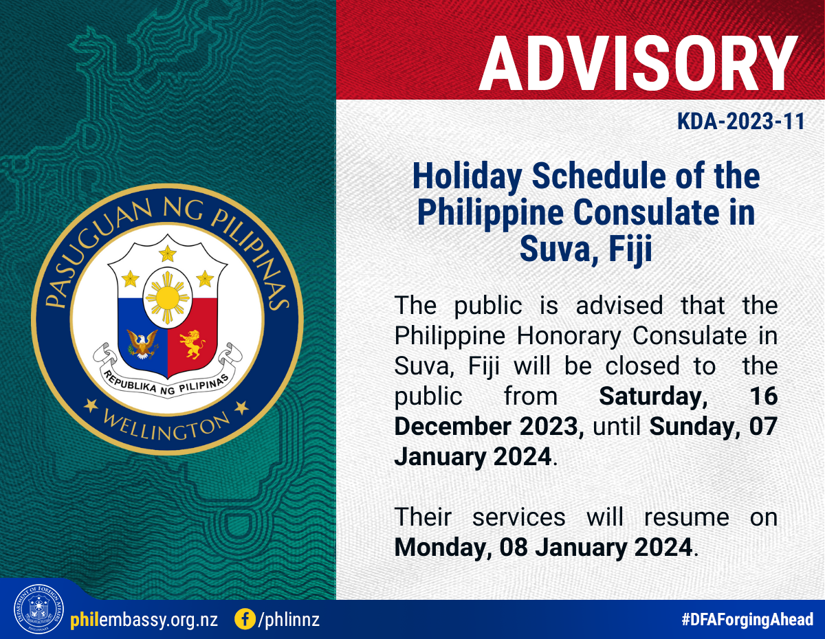The public is advised that the Philippine Honorary Consulate in Suva, Fiji will be closed to the public from Saturday, 16 December 2023, until Sunday,