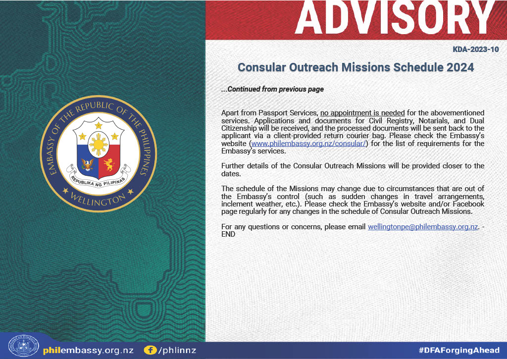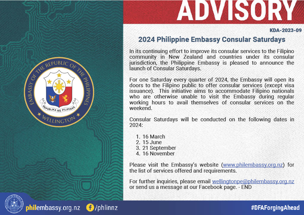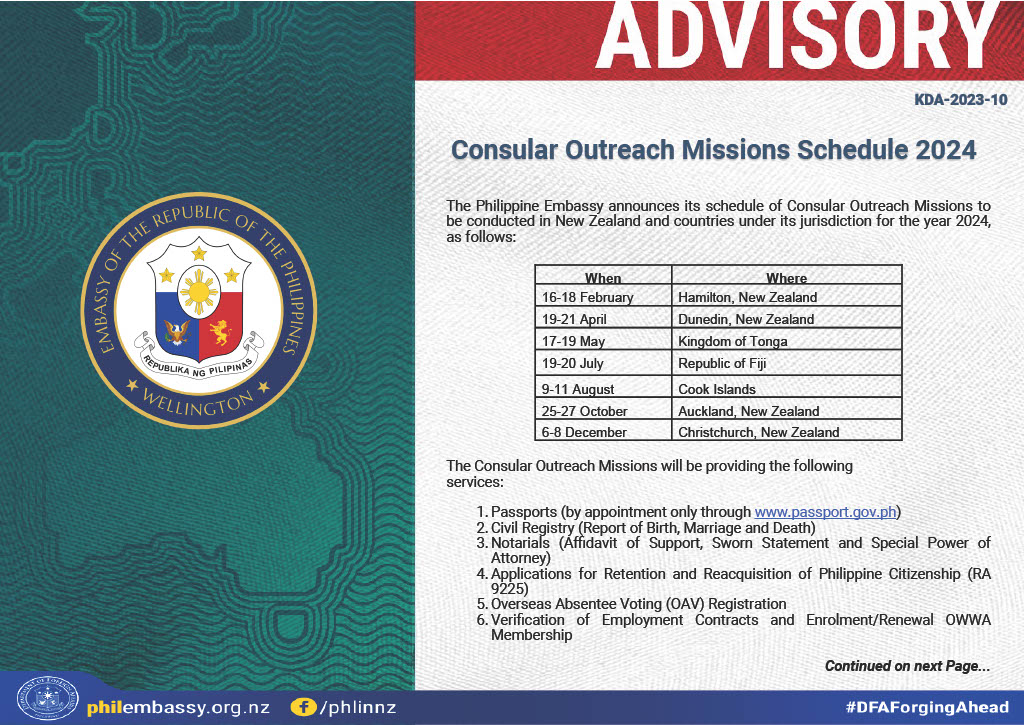 The Philippine Embassy will conduct a consular mission in Christchurch on December 8 - 10, 2023.