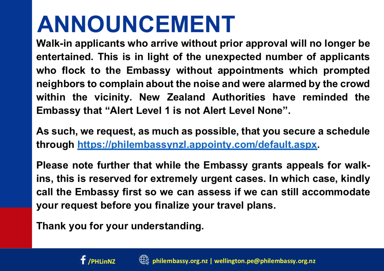 Walk-in applicants who arrive without prior approval will no longer be entertained. This is in light of the unexpected number of applicants who flock to the Embassy without appointments which prompted neighbors to complain about the noise and were alarmed by the crowd within the vicinity. New...