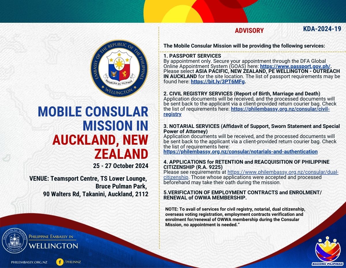 ADVISORY: Schedule and Venue of Mobile Consular Outreach Mission to Auckland from 25 to 27 October 2024.