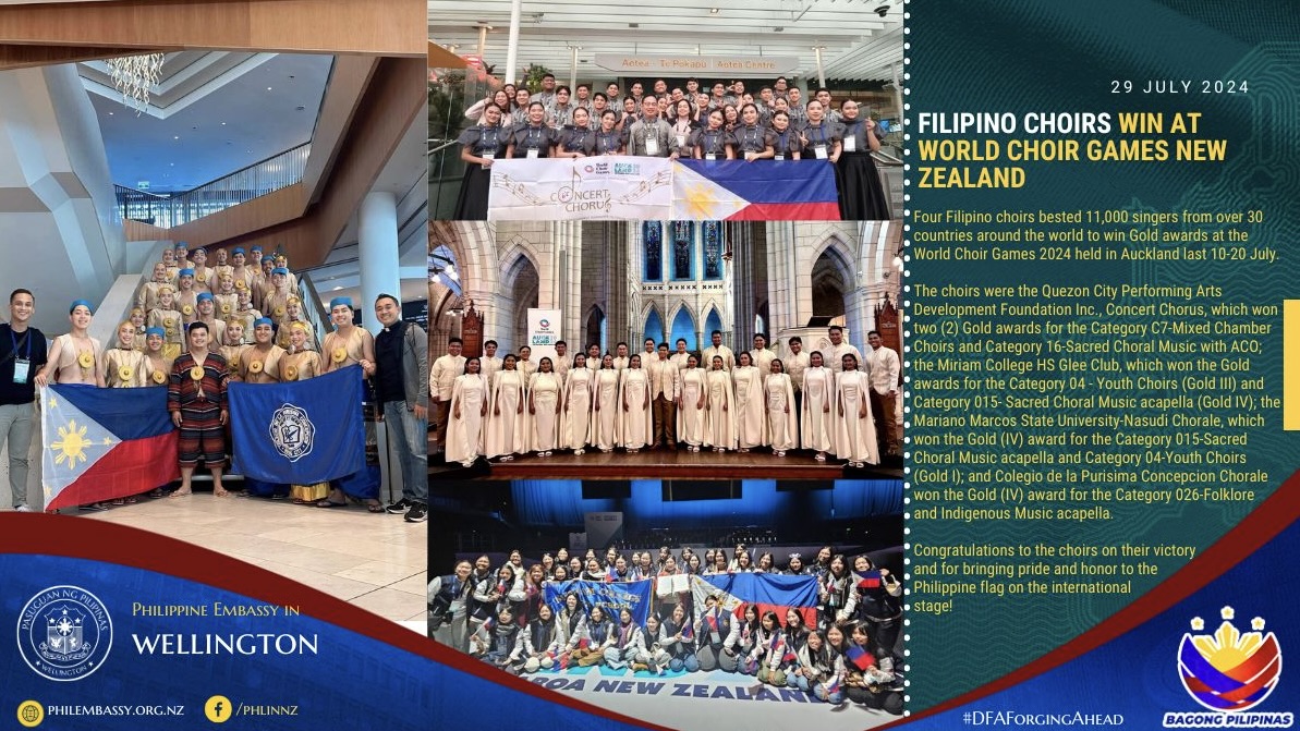Four Filipino choirs bested 11,000 singers from over 30 countries around the world to win Gold awards at the World Choir Games 2024 held in Auckland last 10-20 July.