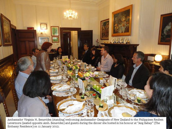 In welcoming Ambassador Levermore and guests, Ambassador Benavidez thanked them for honouring her invitation to experience Filipino hospitality at home which is just a foretaste of what Ambassador Levermore and foreigners will surely have in the Philippines. As Ambassador Benavidez said, Ambassador Levermore will be representing his country and people at a time of significant developments in the Philippines and increasing collaboration and people-to-people exchanges between the Filipinos and New Zealanders especially in the political, security, economic and socio-cultural spheres. She reiterated the deep appreciation of the Philippine Government and People for the immediate assistance of the New Zealand Government through its donation of $500,000 to the Philippine Red Cross for the victims of typhoon “Sendong” last December. “Indeed, the kindheartedness and generosity of New Zealand demonstrate a true friend in times of great need,” Ambassador Benavidez stated.