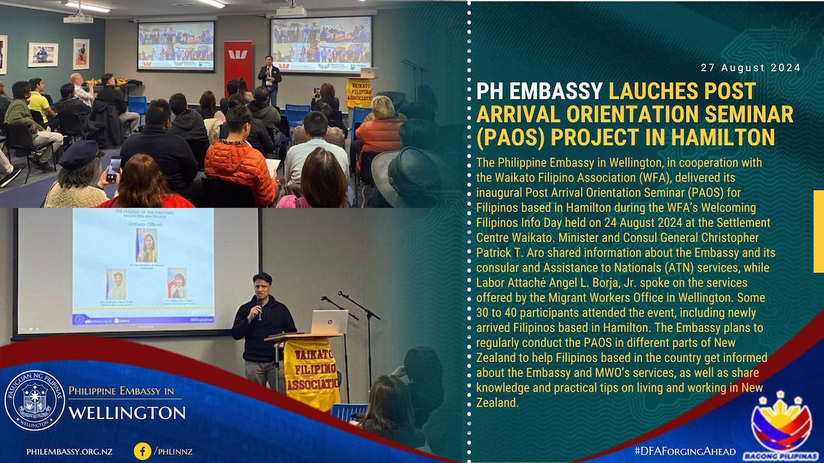 The Philippine Embassy holds its inaugural Post Arrival Orientation Seminar (PAOS) in Hamilton during the Welcoming Filipinos Info Day by the Waikato Filipino Association (WFA). Thank you WFA for accommodating the Embassy during your event!