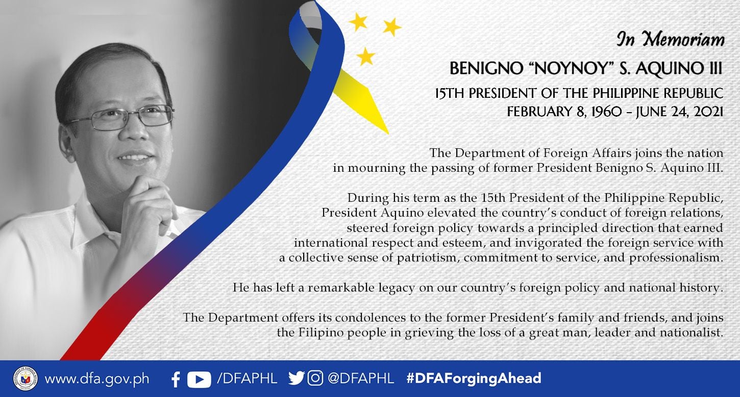 The Philippine Embassy in New Zealand joins the nation in mourning the passing of former President Benigno S. Aquino III.