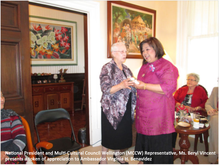 PPSEAWA is composed of women from the Pacific and Southeast Asian regions who come together to promote greater understanding and friendship and engage in projects for the benefit of the children, youth and the local communities. Ambassador Benavidez warmly welcomed PPSEAWA’s Patron, Her Worship Celia Wade Brown, Mayor of Wellington City together with its President, Sylvia Finlay Rawle, Vice-Presidents, Dr. Gloria Hettige and Roz De Lambert, Treasurer, Teresa Hung, National President and Multi-Cultural Council Wellington (MCCW) Representative, Beryl Vincent, National Secretary and Board Member Lonie Martin, National Treasurer and Newsletter Coordinator Anne Penn, Past President and MCCW Representative Glenys Wood, National Vice-President, Life Member and Committee Member Annie Coates and seventeen members to “Ang Bahay” and shared with them the Philippines’ increasingly close friendship and cooperation with New Zealand and the Pacific island nations, the importance of forging deeper partnership with the ASEAN countries and the vital roles that women play in the well-being of peoples across the regions. PPSEAWA’s President Rawle steered the Meeting and Ambassador Benavidez presented Certificates of Appreciation to Beryl Vincent and Lonie Martin as Past Presidents and to Roz De Lambert, Teresa Hung, Joy Pearce and Kath Bell. The officers and members expressed appreciation to Ambassador Benavidez for the hospitality and the wonderful opportunity to gather in amidst the inviting atmosphere of a Filipino home and learn more about the Philippines and the Filipino people’s creativity and artistry.