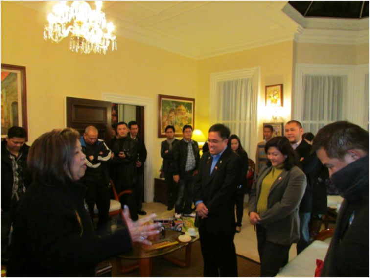Ambassador Virginia H. Benavidez hosted a fellowship dinner in honour of the SMART-GILAS team at “Ang Bahay” (Philippine Ambassador’s residence) on 15 July 2013. In her welcoming remarks, Ambassador Benavidez stated that the presence of SMART GILAS PILIPINAS Team in New Zealand “brings great pride and honour to the Philippines and much excitement and delight to the Filipino community and basketball fans. Basketball is considered as one of our national passion, a centerpiece of our sports development program and an exhibition of our people’s prowess and excellent performance in sports. Through basketball, the Filipino sportsmen are a force to be reckoned with in national, regional and international arenas and become ambassadors of goodwill in promoting friendship and camaraderie. Please take with you our prayers, best wishes and cheers for greater success and victory in the forthcoming FIBA Asia Championships and all your future games.” Both Ambassador Benavidez and Coach Chot Reyes were so happy to meet each other again, this time in Wellington as they recalled the exciting basketball tournaments held in Brunei Darussalam and the enjoyable golf games they played with Filipino and Bruneian golfers a few years ago.