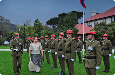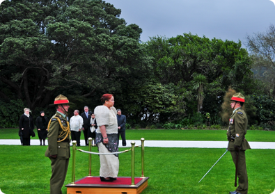 Following the Maori welcome ceremony, consisting of a traditional challenge and exchangeHongi New Zealand of greetings with a “Hongi” (light pressing of noses and head bow signifying the sharing of the breath of life and respect for each other) with the indigenous cultural group and the Inspection of the Military Guard of Honor and the General Salute, Ambassador Benavidez presented her Letters of Credence and Recall of her predecessor to the Governor-General witnessed by the Governor-General’s wife, Lady Janine, the representatives of the Government of New Zealand, senior officials from the Ministry of Foreign Affairs and Trade (MFAT) and Members of the Household. She started her brief remarks with greetings in the Maori language to the Governor-General who is the second Maori to be appointed by the Queen of England to this post. She reiterated the felicitations and greetings of President Benigno S. Aquino III to Sir Jerry Mateparae who has just assumed the post of Governor General and Commander-in-Chief in and over the Realm of New Zealand and conveyed the best wishes of the Government and People of the Republic of the Philippines to the Government and People of New Zealand. She pointed out that Philippines-New Zealand relations since its establishment 45 years ago, bilaterally and multilaterally, can be best described as strong, steadfast, stable and strategic. The Philippine Government attaches great importance to people-to-people ties and interaction at all levels to enhance the Philippines’ long-standing relationship and translate into practical ways the shared commitment of the Philippines and new Zealand to work together and develop alongside each other. Inspection of the GuardsThroughout the years, there have been high level meetings and dialogues, active exchange of visits and broadening cooperation between government officials, business communities and other groups from both countries as well as in the context of ASEAN, APEC, ASEM, the United Nations and other regional and international bodies. The important contributions of the Filipinos and New Zealanders to the national development programs of both countries deepen the reservoir of goodwill with and support for each other. The Philippines will continue to build on this strong foundation of friendship and partnership with New Zealand in the political, economic, defense, education, socio-cultural and various areas and to work hand-in-hand to fulfill both countries’ collective vision for greater peace, progress and prosperity in the region and the world. She ended with Maori expressions of appreciation and goodwill.