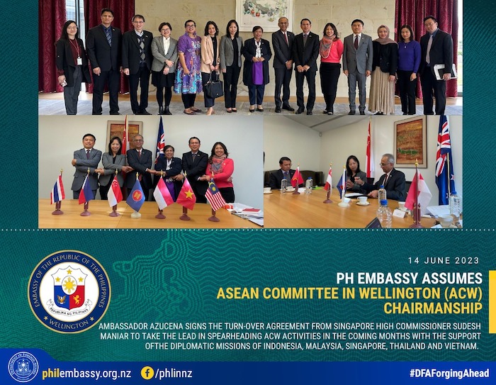 Ambassador Kira Christianne D. Azucena spearheaded the first ASEAN Committee in Wellington (ACW) meeting of the year and signed the turn-over agreement with Thai Ambassador Waravuth Pouapinya with the support of the diplomatic missions of Indonesia, Malaysia, Singapore and Vietnam.