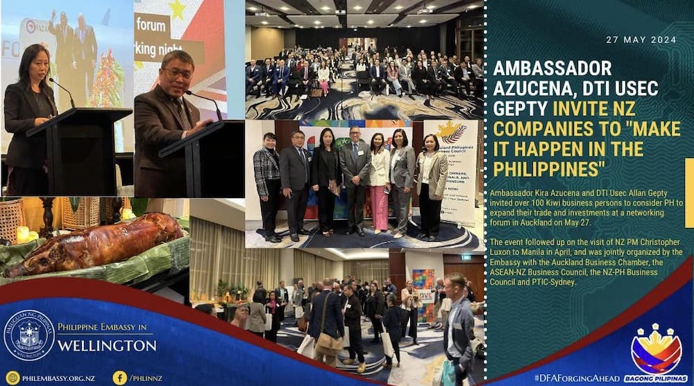Ambassador Kira Azucena and DTI Usec Allan Gepty invited over 100 Kiwi business persons to consider PH to expand their trade and investments at a networking forum in Auckland on May 27.