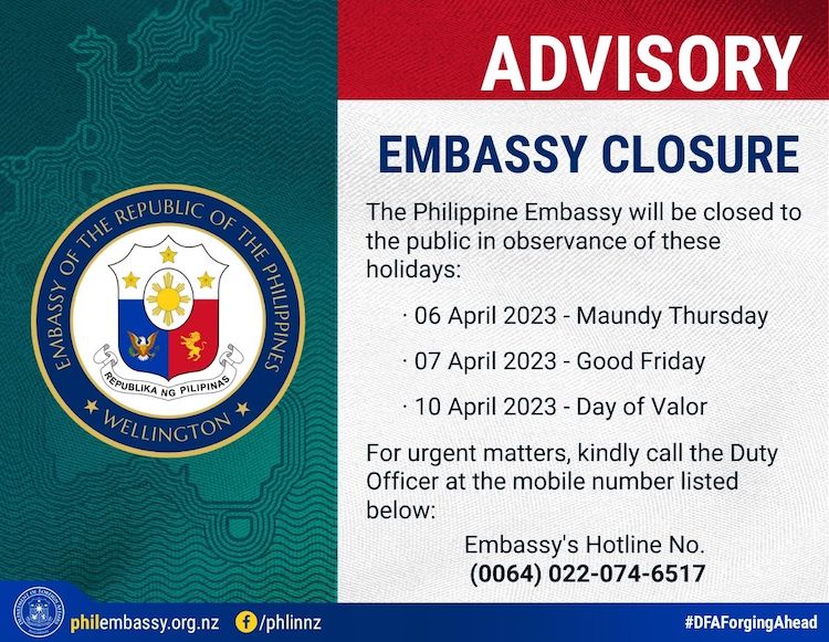 The Philippine Embassy will be closed to the public in observance of the holidays: