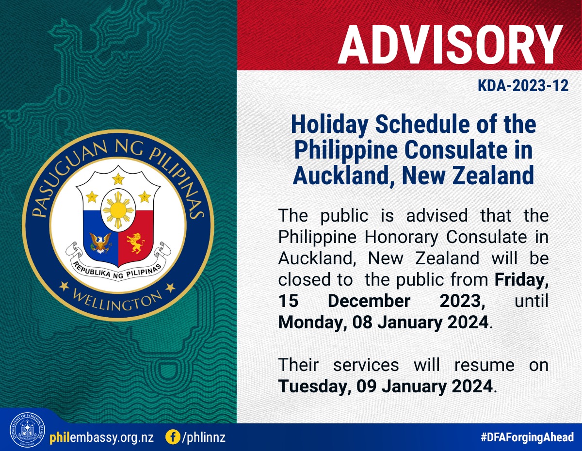 The public is advised that the Philippine Honorary Consulate in Auckland, New Zealand will be closed to the public from Friday, 15 December 2023, until Monday, 08 January 2024.