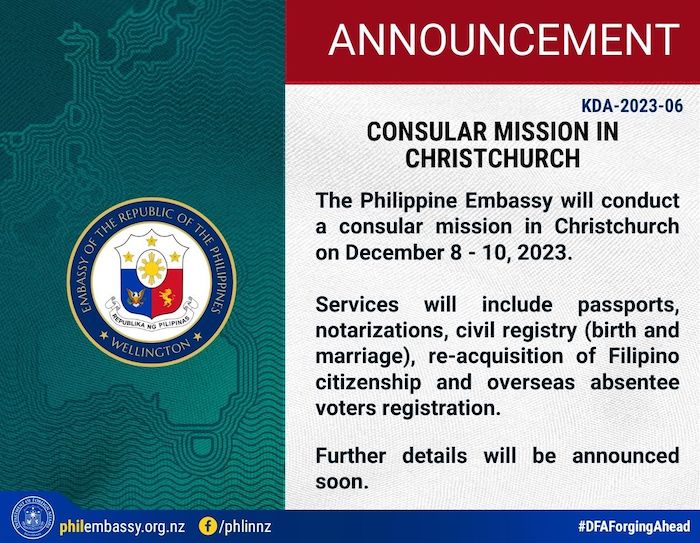 The Philippine Embassy will conduct a consular mission in Christchurch on December 8 - 10, 2023.