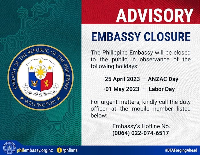 The Philippine Embassy will be closed to the public in observance of the holidays: