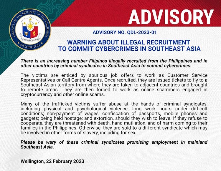 There is an increasing number Filipinos illegally recruited from the Philippines and in other countries by criminal syndicates in Southeast Asia to commit cybercrimes.