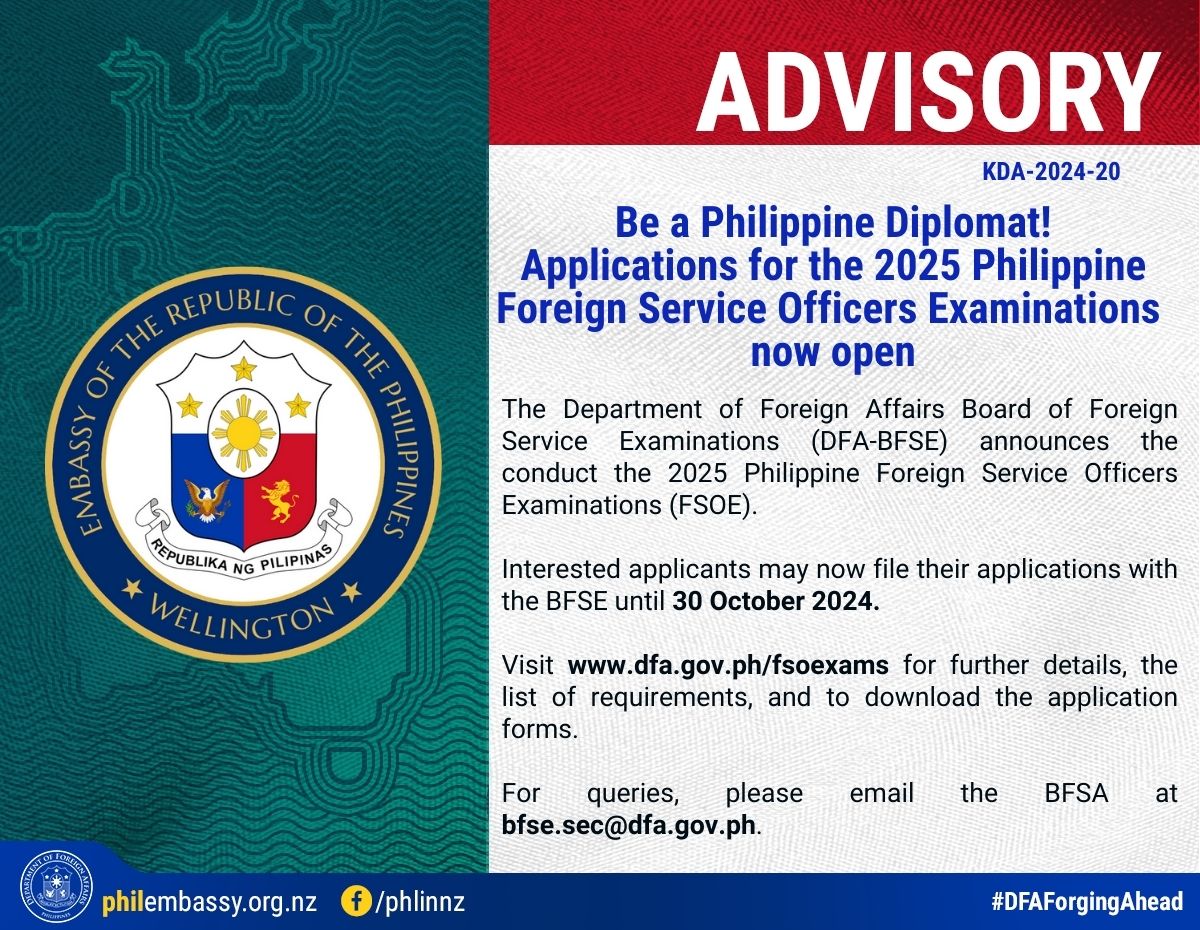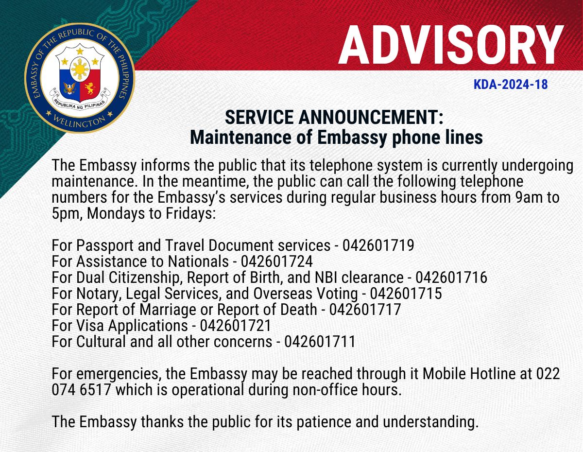 ADVISORY: Schedule and Venue of Mobile Consular Outreach Mission to Auckland from 25 to 27 October 2024.