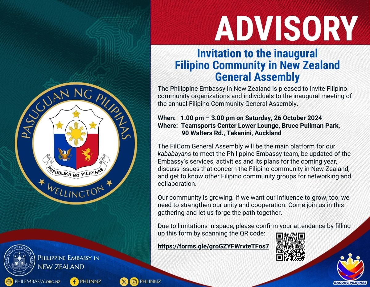 The Philippine Embassy in New Zealand is pleased to invite Filipino community organizations and individuals to the inaugural meeting of the annual Filipino Community General Assembly.