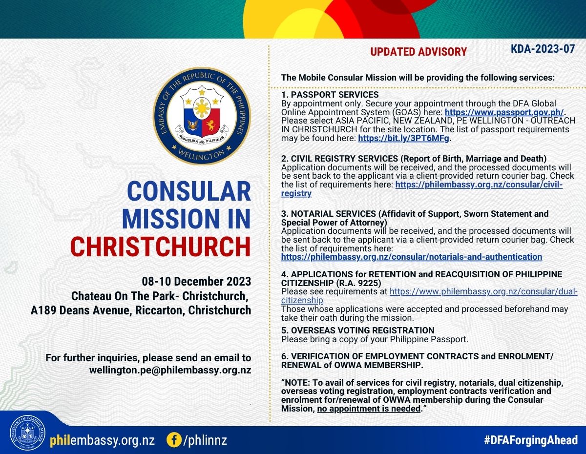UPDATED Consular Services for Filipinos in Christchurch 08-10 December 2023 KDA-2023-07