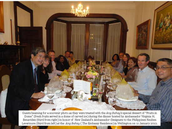 New Zealand’s next Ambassador to the Philippines, Mr. Reuben Levermore, together with Ms. Toni Moyes, Special Advisor Graeme Waters, Mrs. Audrey Waters, Major Lee Turner, Ms. Chris Anderson and Mr. Tom Halliburton were given an introduction to the richness and variety of Filipino cuisine during the dinner hosted by Philippine Ambassador Virginia H. Benavidez at the “Ang Bahay” (Embassy Residence) on 11 January 2012. They were joined by members of the Filipino community, namely, Mr. Antonio Helbano, Mrs. Angela Helbano and Ms. Agnes Espenida and Philippine Embassy’s Consul General Marcos Punsalang, Mrs. Marissa Punsalang and Cultural Officer Liza Jane Estalilla. Amidst the distinctively Filipino ambiance and setting of the Residence, Ambassador Benavidez created a special menu featuring comfort foods, “Sinigang na Isda,” (Fish in tamarind based soup) Caesar’s Salad, Pinoy style, Lemon sorbet, “Lumpiang Sariwa” (Fresh vegetables springroll), “Beef Pochero” (Beef in tomato sauce with vegetables, chickpeas and chorizo), Chicken Adobo (Chicken with garlic, soy sauce and vinegar), Fresh Fruits in Dome and Almond Orange Cake with vanilla ice-cream and dried mangoes.