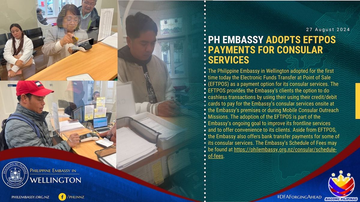 The Philippine Embassy in Wellington now accepts EFTPOS payments for its consular services! Embassy clients can now do onsite cashless transactions at the Embassy!