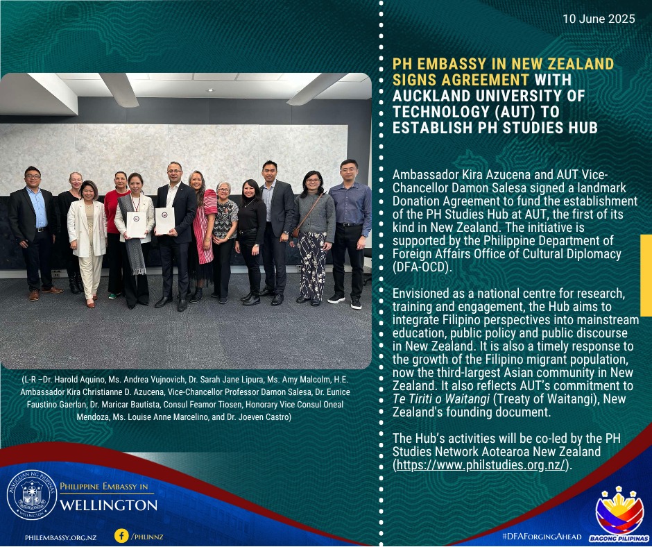 Ambassador Kira Azucena and AUT Vice-Chancellor Damon Salesa signed a landmark Donation Agreement to fund the establishment of the PH Studies Hub at AUT, the first of its kind in New Zealand. The initiative is supported by the Philippine Department of Foreign Affairs Office of Cultural Diplomacy (DFA-OCD).