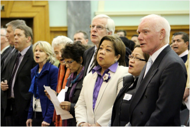 For this second Prayer @ Parliament for the year, Member of Parliament for Hamilton West Tim Macindoe led the opening prayer, Member of Parliament for Wanganui and Honourable Chester Borrows, Minister for Courts, Associate Minister of Justice and Associate Minister for Social Development and Pastor Rasik welcomed everyone present at this special occasion. This was followed by the readings from the New Testament, Romans:1:1-6 and 14-17 by Ambassador Benavidez and Romans 13:1-7 by Deputy Speaker and Member of Parliament for Invercargill, Eric Roy. Individual and group prayers followed the three prayer tracks on the Youth of the Nation with input from Levi Marychurch from Arise Church, the seven sectors of society focusing on Government by Mr. Gordon Copeland, Business by Mr. Francis Burdett, Church by Pastor Hamish Thomson, Family by Pastor Lalita Ranchord, Media by Mr. Errol Pike, Sport by Mr. Kevin Goldsbury and Education by Mr. Brian Caughley and the Gospel and Government by Pastor Rasik. The ALC Worship Team sang the National Anthem of New Zealand and the opening and closing praise songs.
