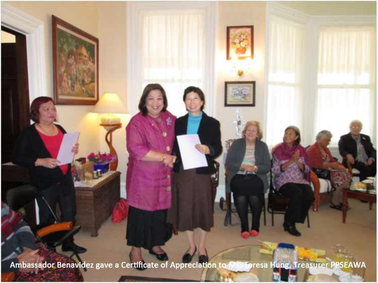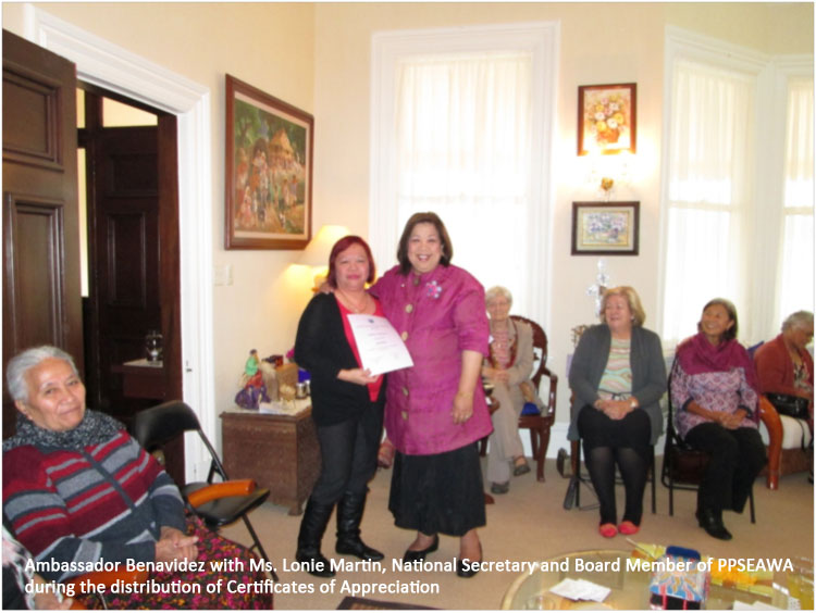 PPSEAWA is composed of women from the Pacific and Southeast Asian regions who come together to promote greater understanding and friendship and engage in projects for the benefit of the children, youth and the local communities. Ambassador Benavidez warmly welcomed PPSEAWA’s Patron, Her Worship Celia Wade Brown, Mayor of Wellington City together with its President, Sylvia Finlay Rawle, Vice-Presidents, Dr. Gloria Hettige and Roz De Lambert, Treasurer, Teresa Hung, National President and Multi-Cultural Council Wellington (MCCW) Representative, Beryl Vincent, National Secretary and Board Member Lonie Martin, National Treasurer and Newsletter Coordinator Anne Penn, Past President and MCCW Representative Glenys Wood, National Vice-President, Life Member and Committee Member Annie Coates and seventeen members to “Ang Bahay” and shared with them the Philippines’ increasingly close friendship and cooperation with New Zealand and the Pacific island nations, the importance of forging deeper partnership with the ASEAN countries and the vital roles that women play in the well-being of peoples across the regions. PPSEAWA’s President Rawle steered the Meeting and Ambassador Benavidez presented Certificates of Appreciation to Beryl Vincent and Lonie Martin as Past Presidents and to Roz De Lambert, Teresa Hung, Joy Pearce and Kath Bell. The officers and members expressed appreciation to Ambassador Benavidez for the hospitality and the wonderful opportunity to gather in amidst the inviting atmosphere of a Filipino home and learn more about the Philippines and the Filipino people’s creativity and artistry.