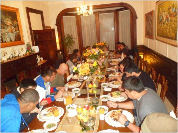 The Philippine Embassy team and families, Fr. Elmer Ibarra, SVD, and Parish Priest of St. Patrick’s Parish in Wainuiomata, the officers and members of the Wellington Filipino Sports Association and the Pinoy NZ Lower Hutt Basketball Club, Inc. and friends from the Filipino community, had a great and enjoyable evening of fun, laughter and fellowship with SMART GILAS Coach Chot Reyes, Coach Jong Uichico, Team Manager Butch Antonio, Assistant Coach Josh Reyes, Team Physiotherapist Dexter Aseron, Team Logistics Manager Rogelio Talabot, New Zealand Team organizer David Perez, Veteran international basketball mentor Tab Baldwin and players Marcus Douthit, Jimmy Alapag, Jayson Castro, Ranidel De Ocampo, Larry Fonacier, Jeff Chan, Gabe Norwood, LA Tenorio, Japeth Aguilar, Gary David, Marc Pingris, Beau Belga and Junmar Fajardo. Coach Reyes conveyed the deep appreciation of the SMART GILAS PILIPINAS Team for the warm reception and gracious hospitality as they readily gave in to many photo opportunity requests from the Philippine Embassy officers, staff, families and members of the Filipino community, sang Filipino and English songs from the Magic Sing karaoke set, cracked jokes, rendered special song and dance numbers, played “sungka” and felt at home and relaxed amidst the Filipiniana ambience and atmosphere of “Ang Bahay.” They thoroughly enjoyed a hearty Filipino dinner of “Pork Sinigang” soup, “Kare-Kare” (Beef, Tripe and Vegetables), Fish and Potato cutlets, Meat Springrolls, Sizzling Shrimp Gambas, Pork Barbecue, “Pancit Canton” (Noodles with Meat and Vegetables), home-made “Taho” (Soybean, Tapioca Pearls and Cane Sugar syrup), “Leche Flan” (Egg custard) and “Churros” with Hot Chocolate especially prepared for the Team and the guests on this joyful and special occasion.