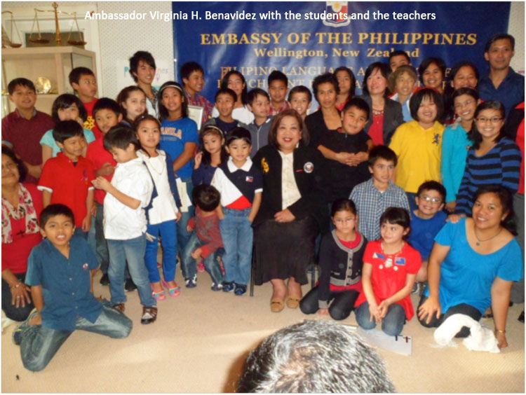 Jennifer Connolly from the Juniors group and Jin Kato from the Seniors group spoke about how much they learned and appreciated their Filipino roots and heritage, how important for them to know more about their parent’s homeland, the Filipino values and traditions and to be able to greet, speak, sing and dance the Filipino way and how they enjoyed being together with their classmates and friends. They thanked their parents, teachers and the Philippine Embassy for the highly useful and enjoyable programme. In behalf of the parents, families and relatives, Mr. Peter Mulqueen and Mrs. Minnie Connolly reiterated their deep appreciation to the Philippine Embassy, the teachers, coordinators and assistants and all those who worked hard to ensure that their children and the other students learn much from FILCEP. They conveyed the unanimous feedback from parents that the programme provided the much needed and long awaited opportunity for their children to know and appreciate Filipino language and culture. For their part, Ms. Zenaida Savill and Ms. Ruth Abenojar-Yee reiterated the gratitude of the teachers to the Philippine Embassy officers and staff, parents and all those who assisted them in successfully implementing FILCEP for the benefit and enjoyment of the students. They all said that the students who participated in the first run of FILCEP are truly remarkable, wonderful and eager to learn about the Philippines and the Filipino people and to make good friends and close bonding among themselves. Just like the parents and the relatives, they all look forward to holding the second and subsequent runs of FILCEP. There were presentation of the Philippine alphabet, songs, dances by the entire class, recitation of the Dr. Jose P. Rizal’s poem entitled “Sa Aking Mga Kababata” and awarding of certificates of attendance to the students and certificates of appreciation to the volunteer teachers, coordinators and assistants. Certificates for the Most Diligent were given to Isabella Samaniego and Samantha Samaniego, Most Creative to Micole Marquez and Angelo Torino and Most Energetic/Most Enthusiastic to Miguel Herrera and Mia Abenojar-Yee. Consul Macaisa delivered the closing remarks and said that the FILCEP constitutes a vital component of the Philippine Embassy’s cultural diplomacy thrusts and its partnership with the Filipino community in implementing the programme will go a long way in instilling love for country, family values and knowledge and understanding of Philippine history, language, culture and the arts, especially among the younger generation of Filipinos in New Zealand.
