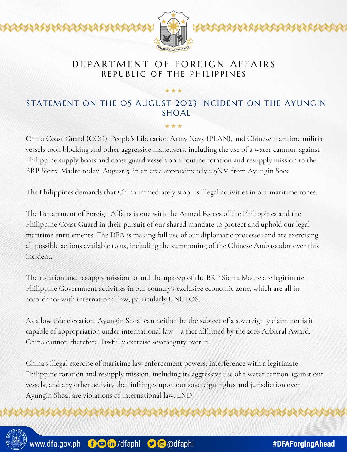 READ #DFAStatement: Statement on the 05 August 2023 Incident on the Ayungin Shoal