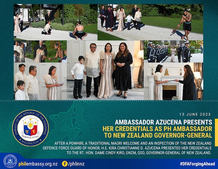After a Powhiri, a traditional Maori welcome and an inspection of the New Zealand Defence Force Guard of Honor, H.E. Kira Christianne D. Azucena presented her credentials to the Rt. Hon. Dame Cindy Kiro, GNZM, QSO, Governor-General of New Zealand.