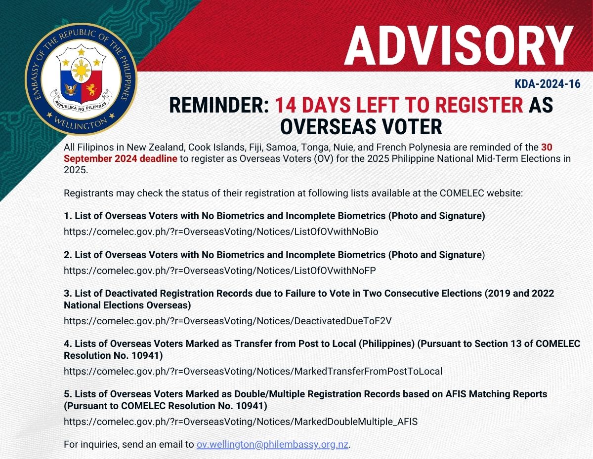 ADVISORY: Overseas Field Registration in Auckland, from 28-29 September at the Philippine Honorary Consulate General. Take advantage of this opportunity to register before the 30 September deadline! See you there!
