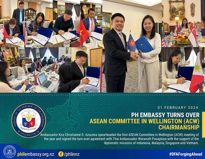 Ambassador Kira Christianne D. Azucena spearheaded the first ASEAN Committee in Wellington (ACW) meeting of the year and signed the turn-over agreement with Thai Ambassador Waravuth Pouapinya with the support of the diplomatic missions of Indonesia, Malaysia, Singapore and Vietnam.