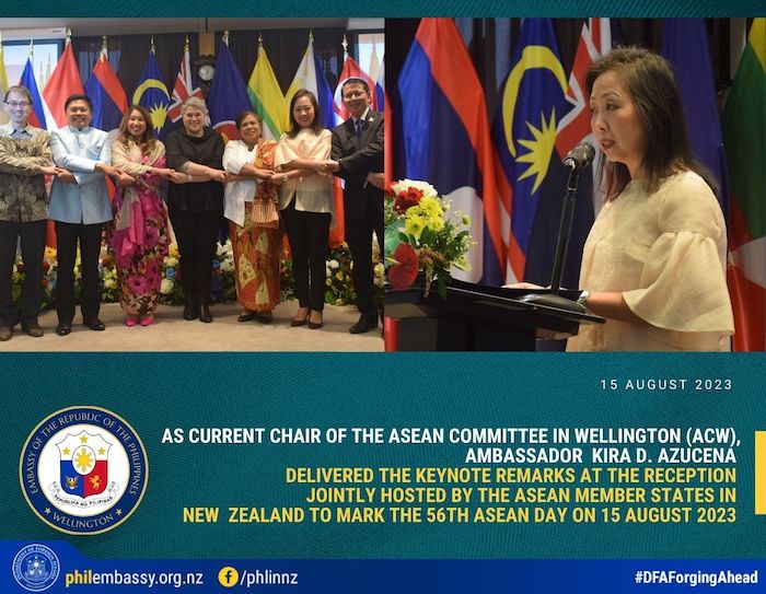 As Current Chair Of The Asean Committee In Wellington (Acw), Ambassador Kira D. Azucena delivered the keynote remarks at the reception jointly hosted by the ASEAN member states in New Zealand to mark the 56th ASEAN Day On 15 August 2023.